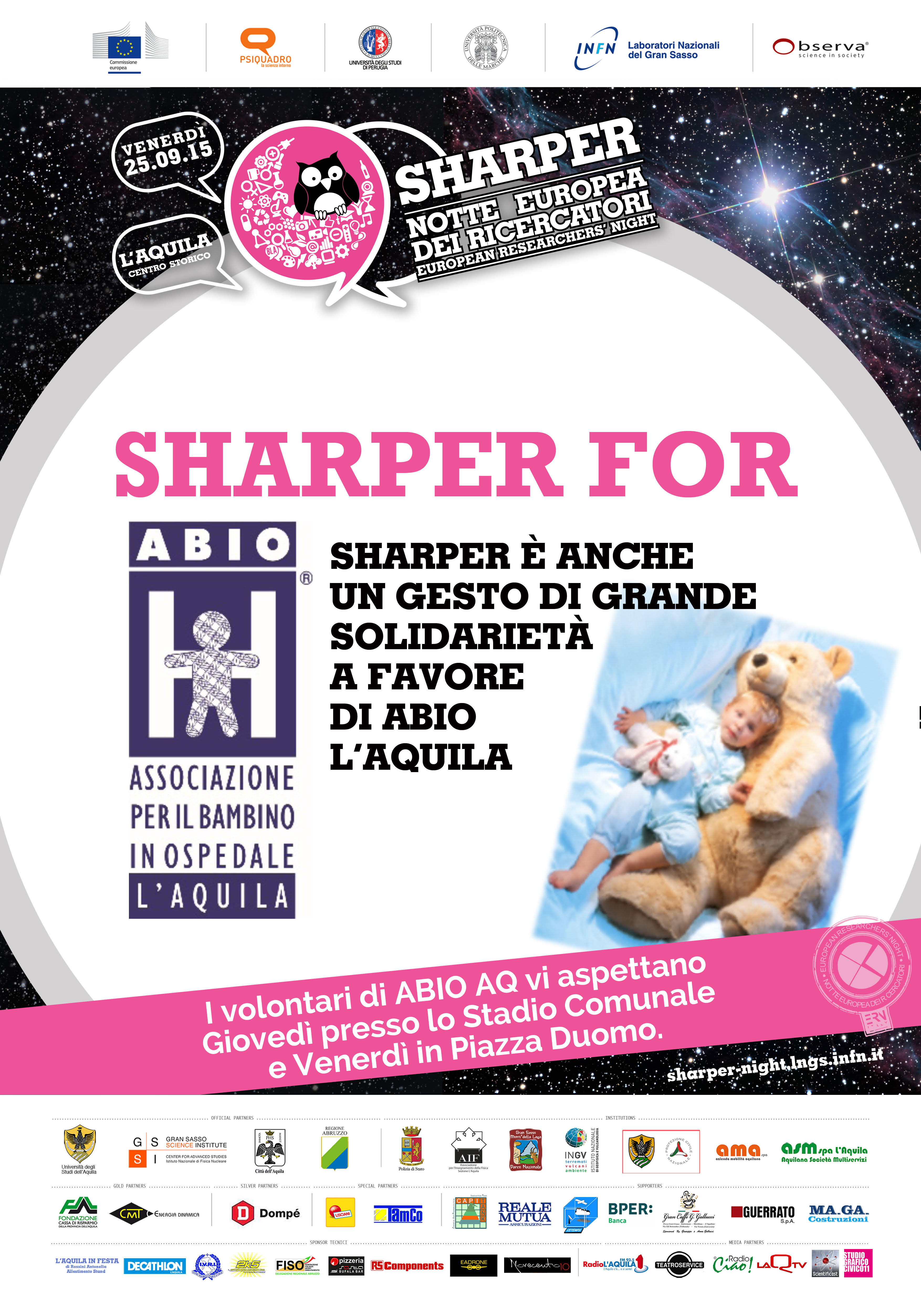 Quest’anno SHARPER2015 è anche un gesto di grande solidarietà per ABIO L’Aquila! Venite a conoscere i volontari ABIO giovedì 24 allo stadio Fattori aspettando Sharper con il torneo di calcio “Sfida di Cervelli” e venerdì 25 in Piazza Duomo! Vi aspettiamo per raccontarvi il nostro impegno quotidiano accanto ai bambini ricoverati e alle loro famiglie!